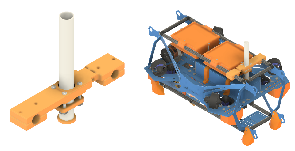 My other main mechanical contribution to SubjuGator 9 was its hardware kill system. As a requirement from RoboSub, the vehicle must be able to be disabled by a diver by interacting with the submarine. Previous versions of this system for our vehicles had been difficult to use or included components that easily broke. To solve this problem, I created a simple 3D printed assembly (Fig. 3) that houses a “kill wand” that can be pulled to deactivate the submarine. At the end of the kill wand there is a magnet which interacts with a hall effect sensor inside the main hull of the submarine. When the wand is pulled, this is registered by the hall effect sensor, which then turns off relays that send power to the thrusters, disabling the submarine. Another issue with previous versions of the kill system that included a kill wand were that the wand was often dropped after being pulled, often causing a swimmer to have to swim into a deep pool. To solve this issue, I made it so the wand cannot be removed, but still pulled up. There is a bolt going through the bottom section of the kill wand that stops the wand from being completely removed, while still allowing enough travel (about 2”) to make it obvious if the wand has been pulled.